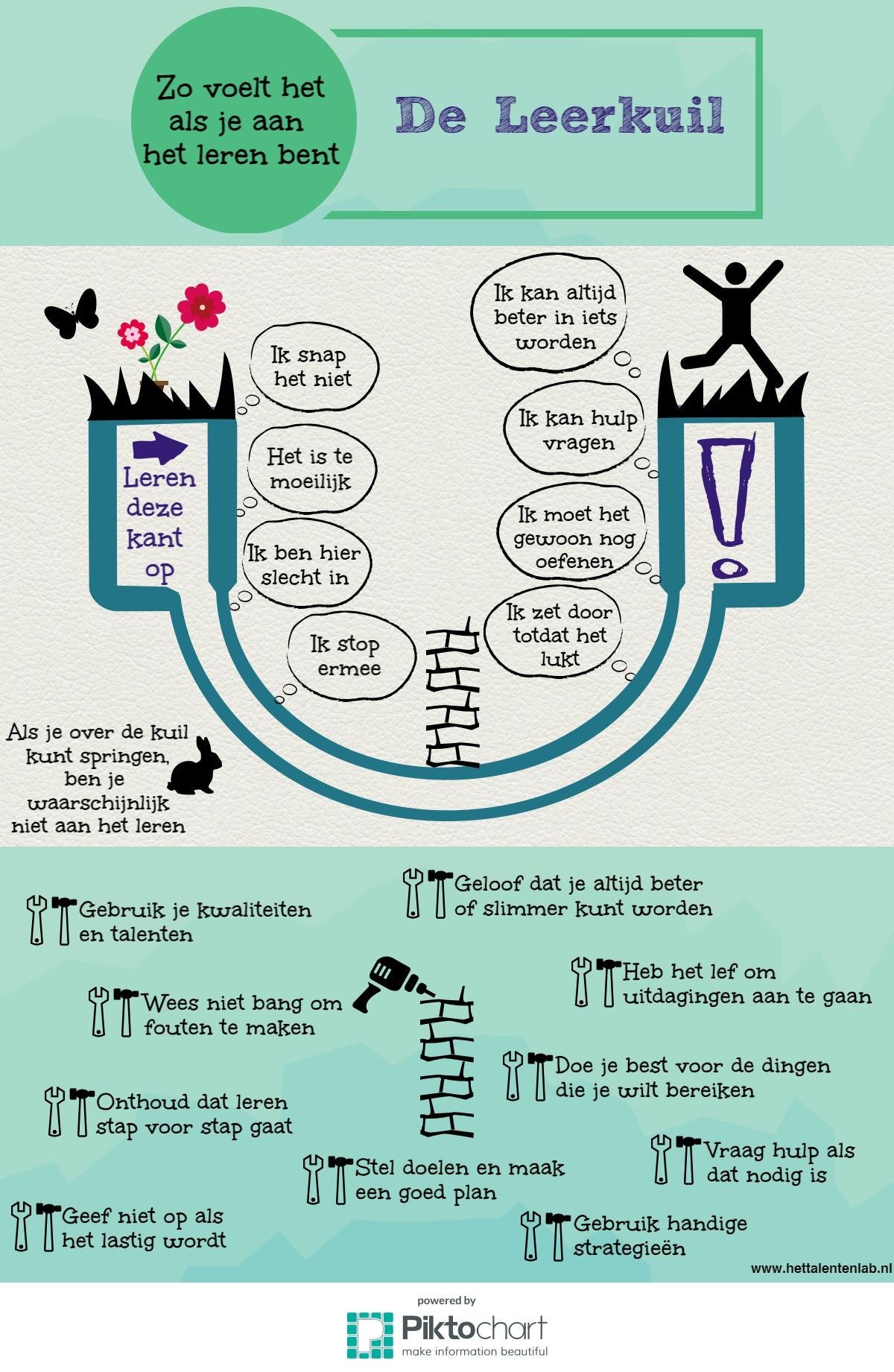Het is aan leerkrachten en begeleiders om deze leerlingen hierin te begeleiden. Te benoemen dat de leerling aan het begin van de leerkuil staat. Accepteer niet dat de leerling eroverheen wil springen (makkelijker werk) maar help de leerling erdoorheen!